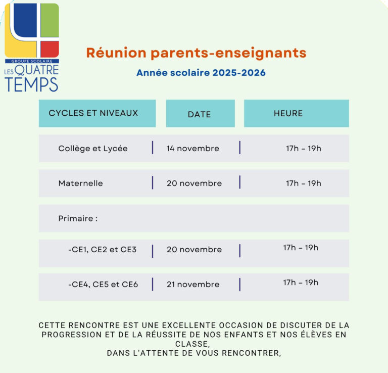 Chers parents,Le Groupe Scolaire Les Quatre Temps a le plaisir de vous inviter aux réunions parents-enseignants, un moment d’échange…